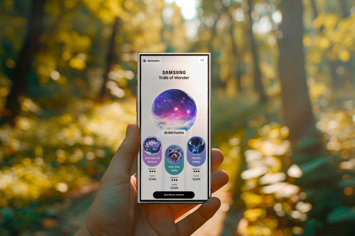 For the launch of the Galaxy S24 Ultra, we created the game app Trails of Wonder, combining AR and AI in an outdoor game where users explore virtual worlds in real nature.
