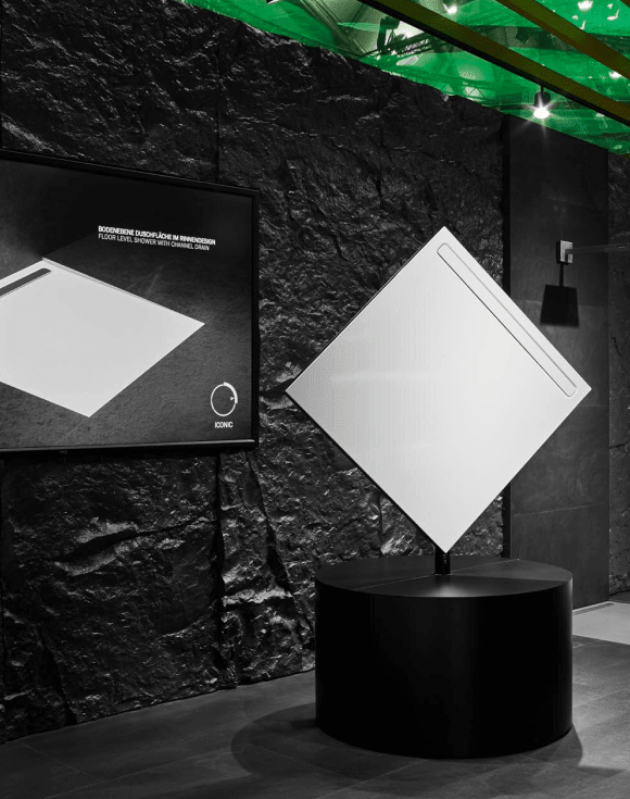 The rotation of the shower base navigates all pertinent product information. Trade exhibition attendees could flip through specific features, design alternatives and installation guidelines just by rotating the shower base.