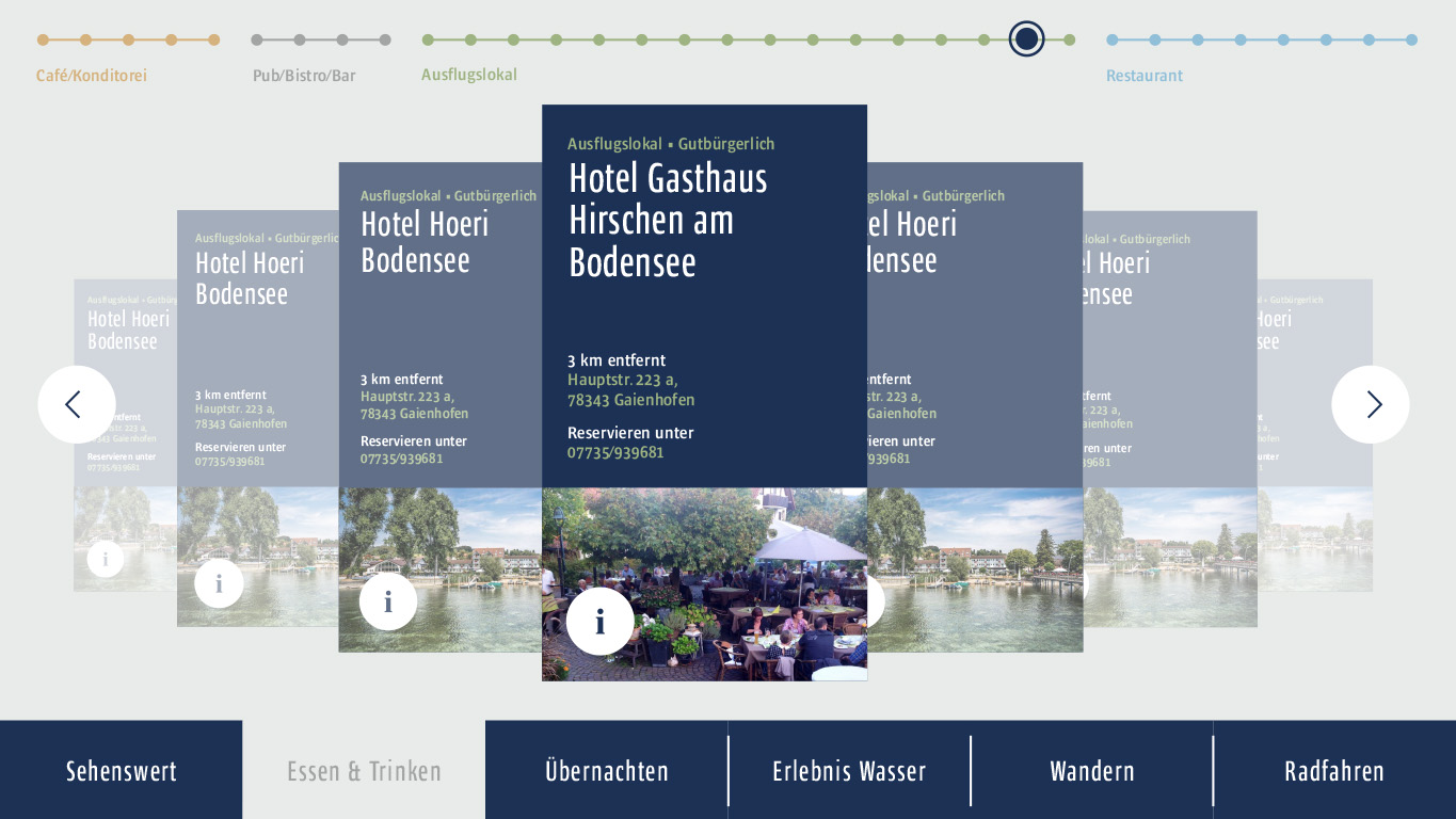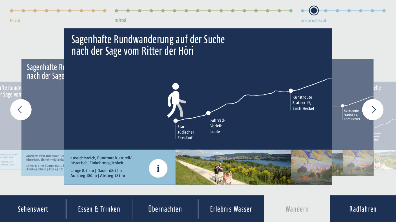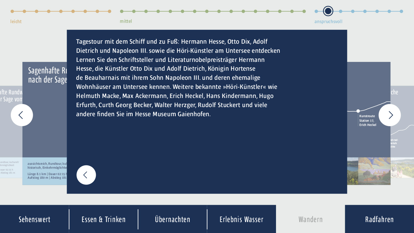 We added a multimedia installation to the tourist information in Gaienhofen, which visitors can use to discover touristic sights, accommodation, cycling and hiking trails.
