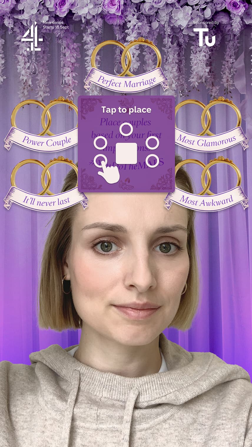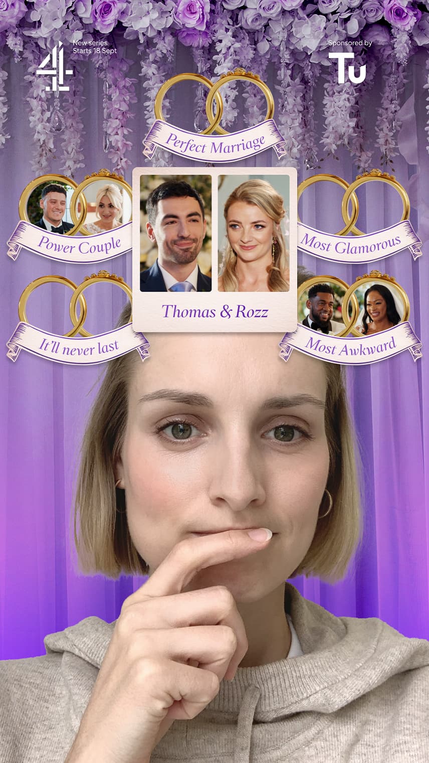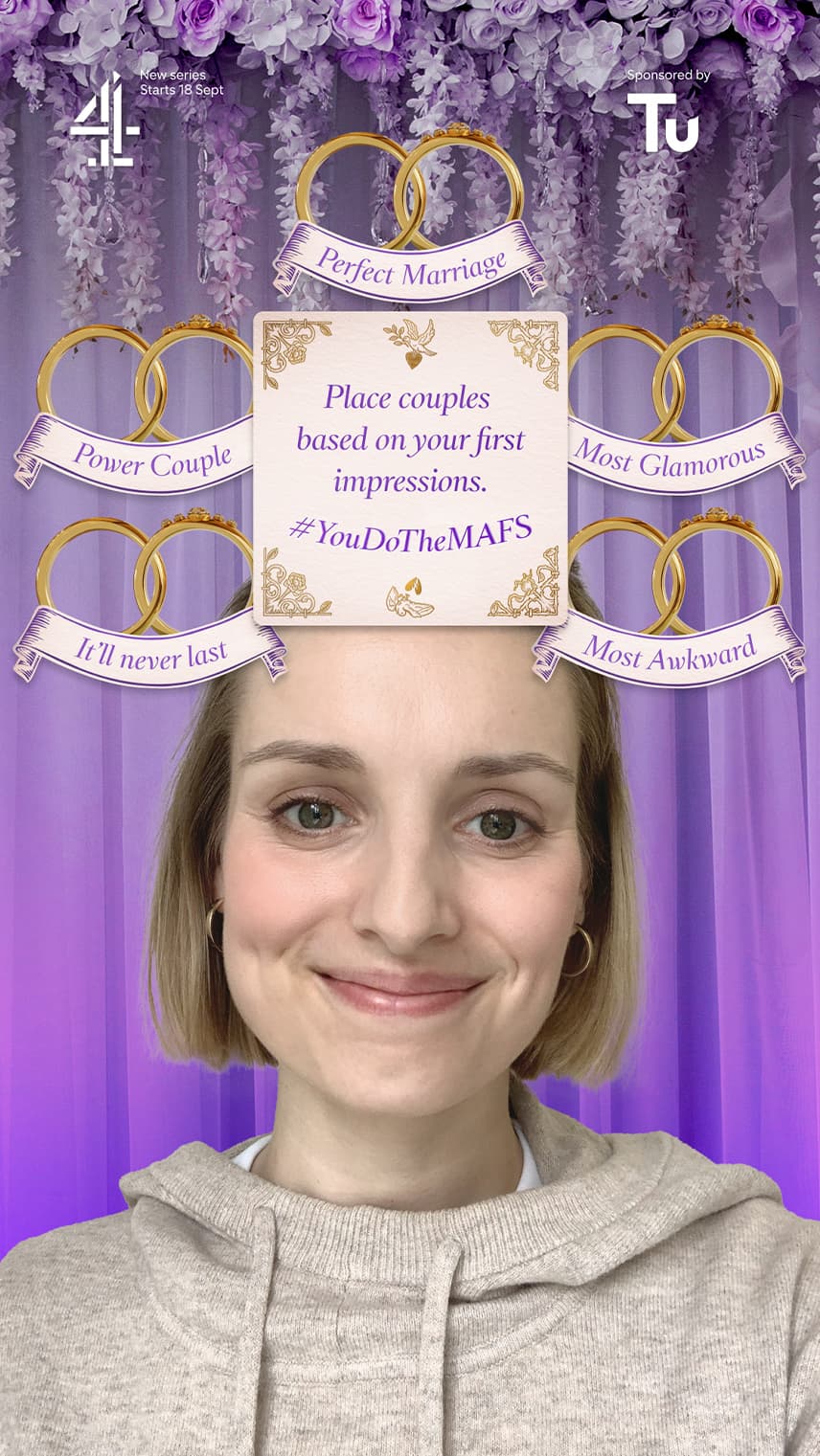 In Channel 4's reality TV show Married at First Sight (MAFS), strangers are matched by experts and meet for the first time on their wedding day. During the show, viewers naturally morph into relationship 'experts'. To tap into this and create a deeper connection with the show, we created a TikTok AR effect that lets users become the MAFS expert themselves.