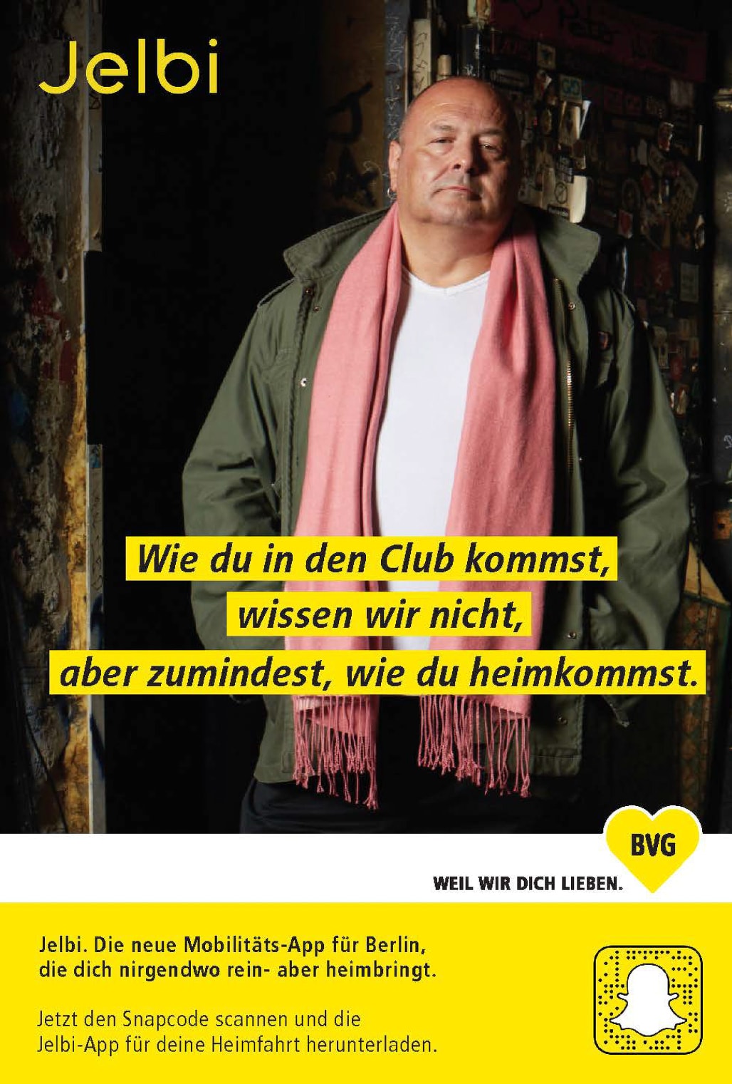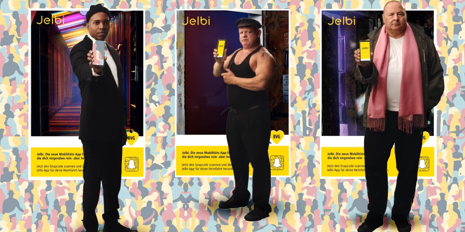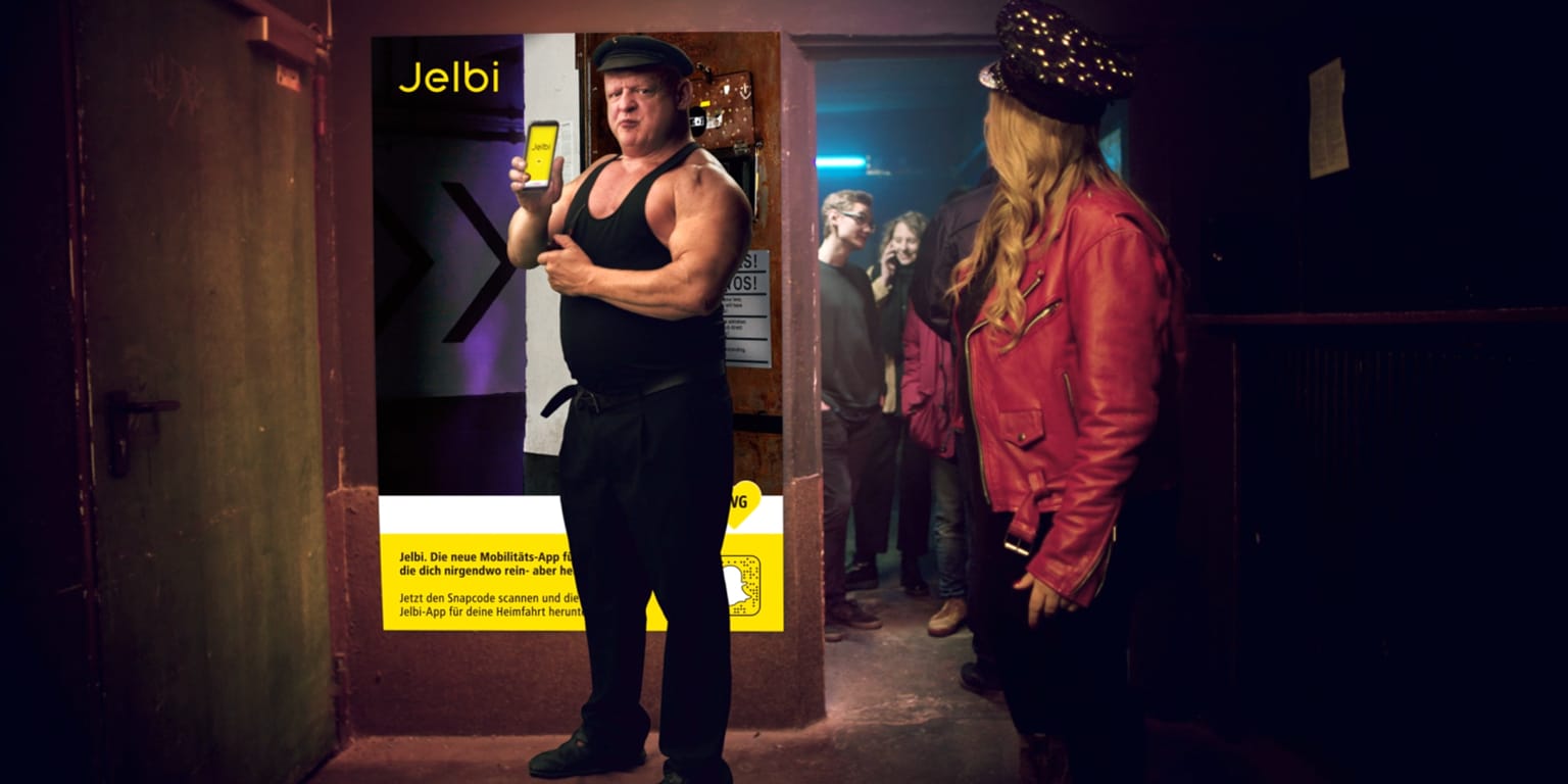 Three famous doorman from Berlin's club scene emerge from the poster when viewed through a Snapchat Lens and instruct users on how to go home safely with BVG Jelbi.
