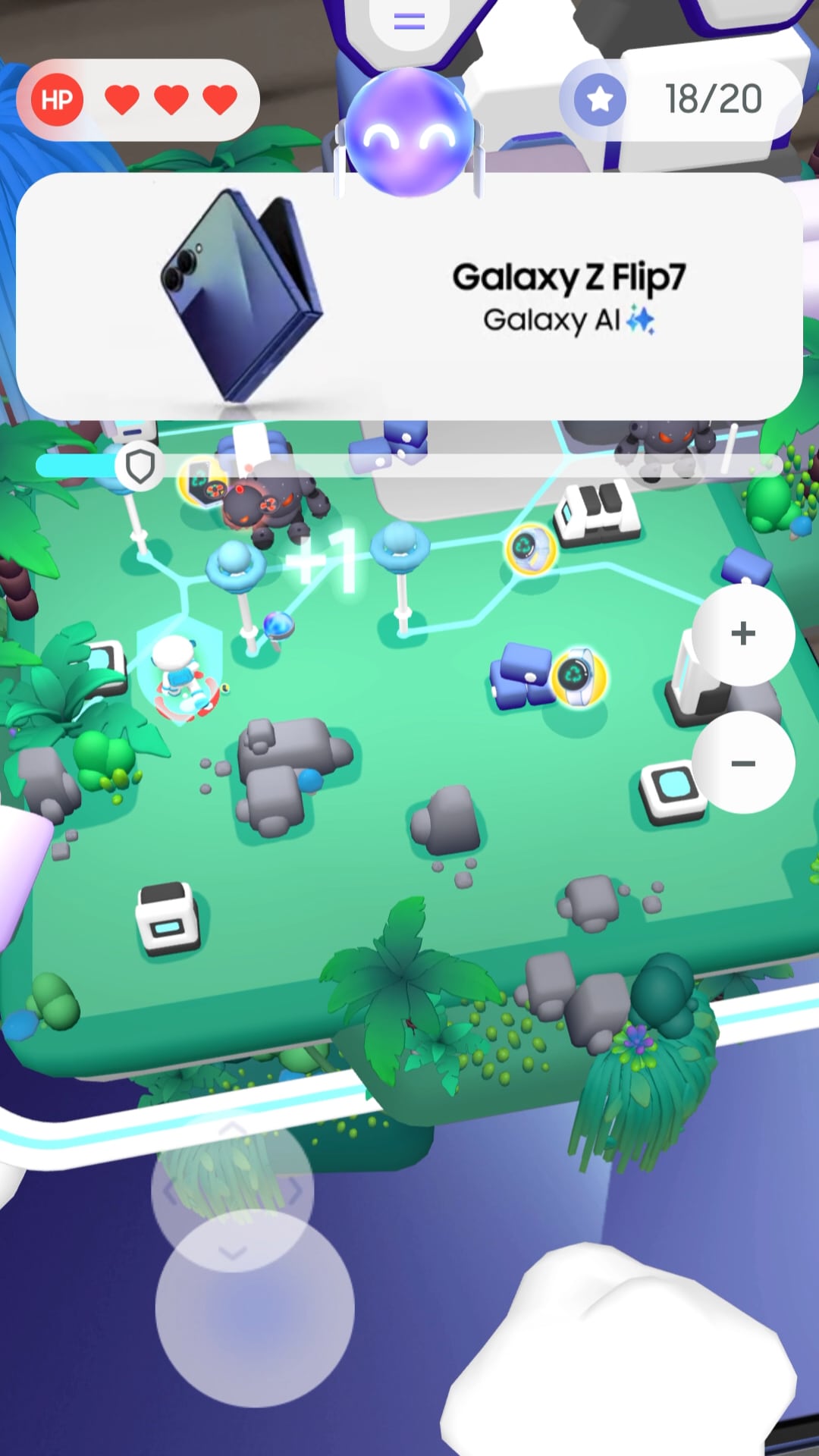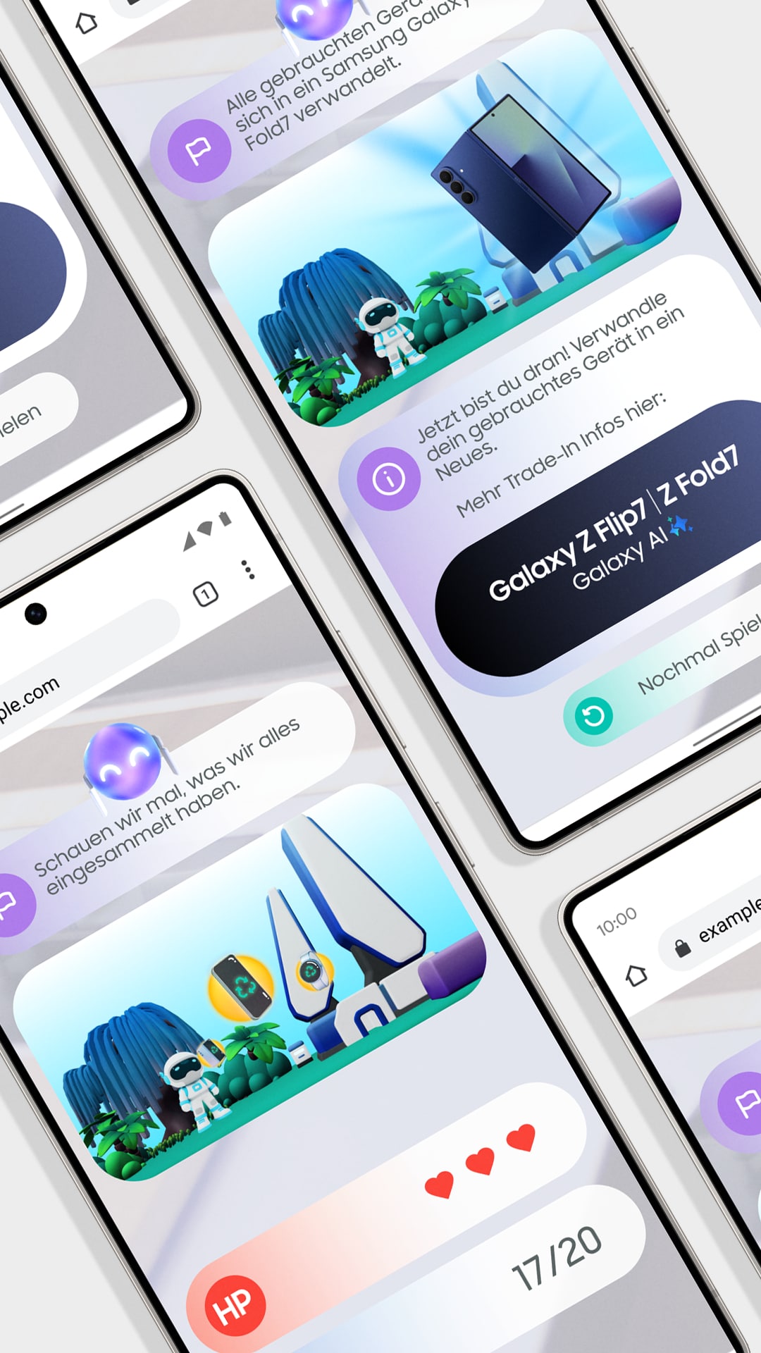 We wove in the Samsung product features and trade-in promotion into gameplay rather than direct sales messaging. Samsung's Now Brief assistant takes physical form as friendly companion, who leads user through the experience. While the Galaxy Fold becomes an entertainment canvas, opening up the game world for customers. Additionally the game displays product ads.
