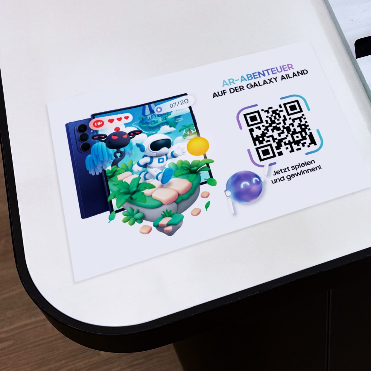 Our solution: The webAR-Game AI-Island that prompts customers to think about trading-in their old device for a new Samsung phone through gameplay. As the game is tied to an AR-Marker it physically anchors customers to
