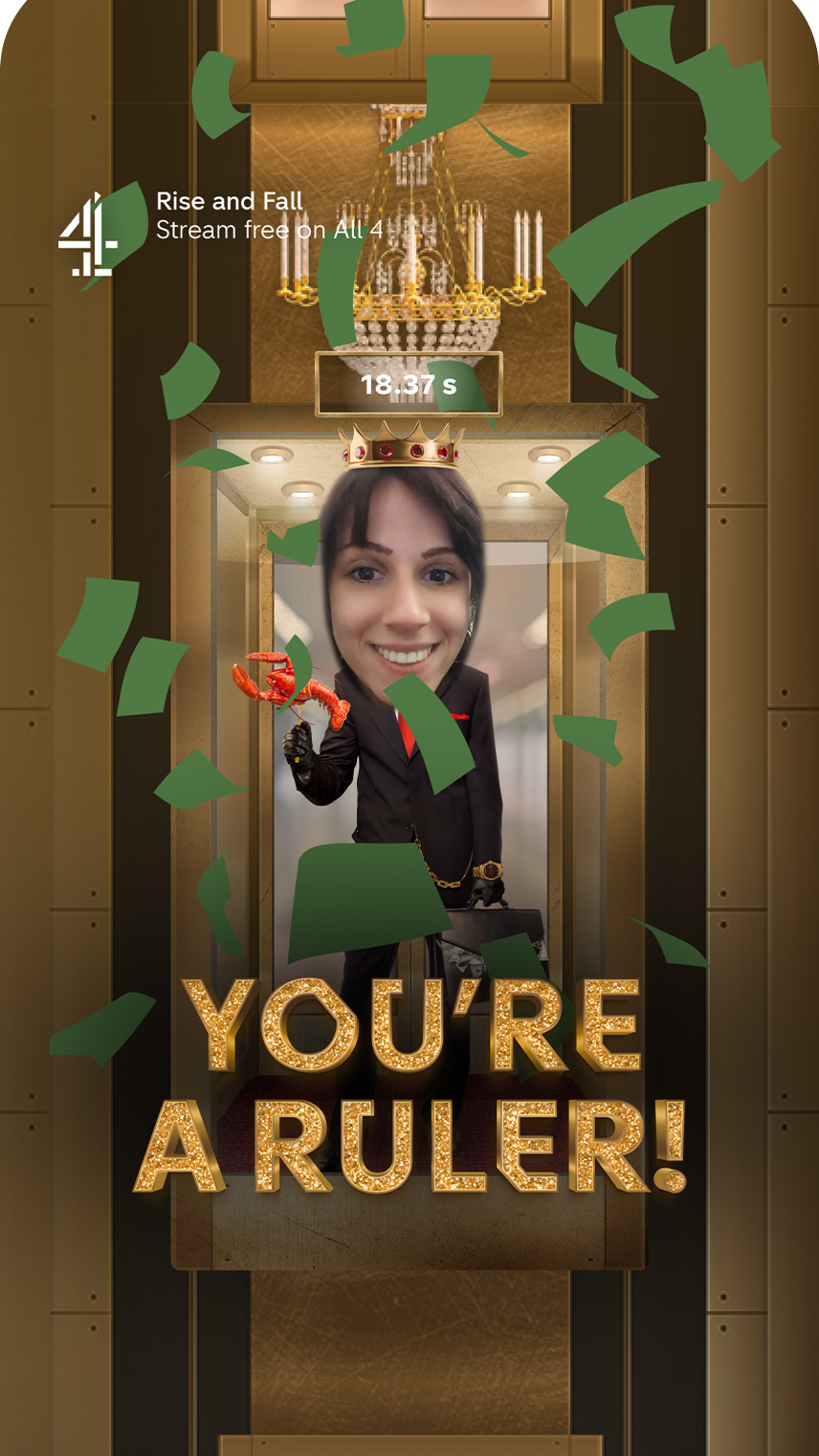 The reality TV show Rise and Fall is all about climbing up the social ladder. The effect transforms users into contestants rising to the top via the show's iconic elevator. Users can race against their friends and climb to the top floor as fast as possible. By introducing a competitive element, the effect not only promotes the show but also encourages repeated use, increasing visibility and interaction rates.