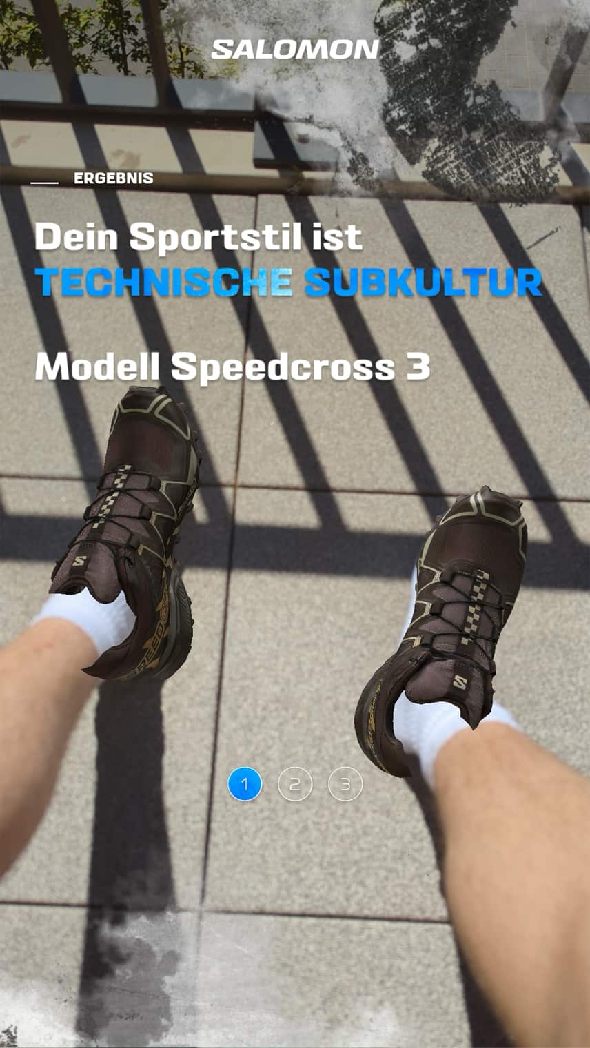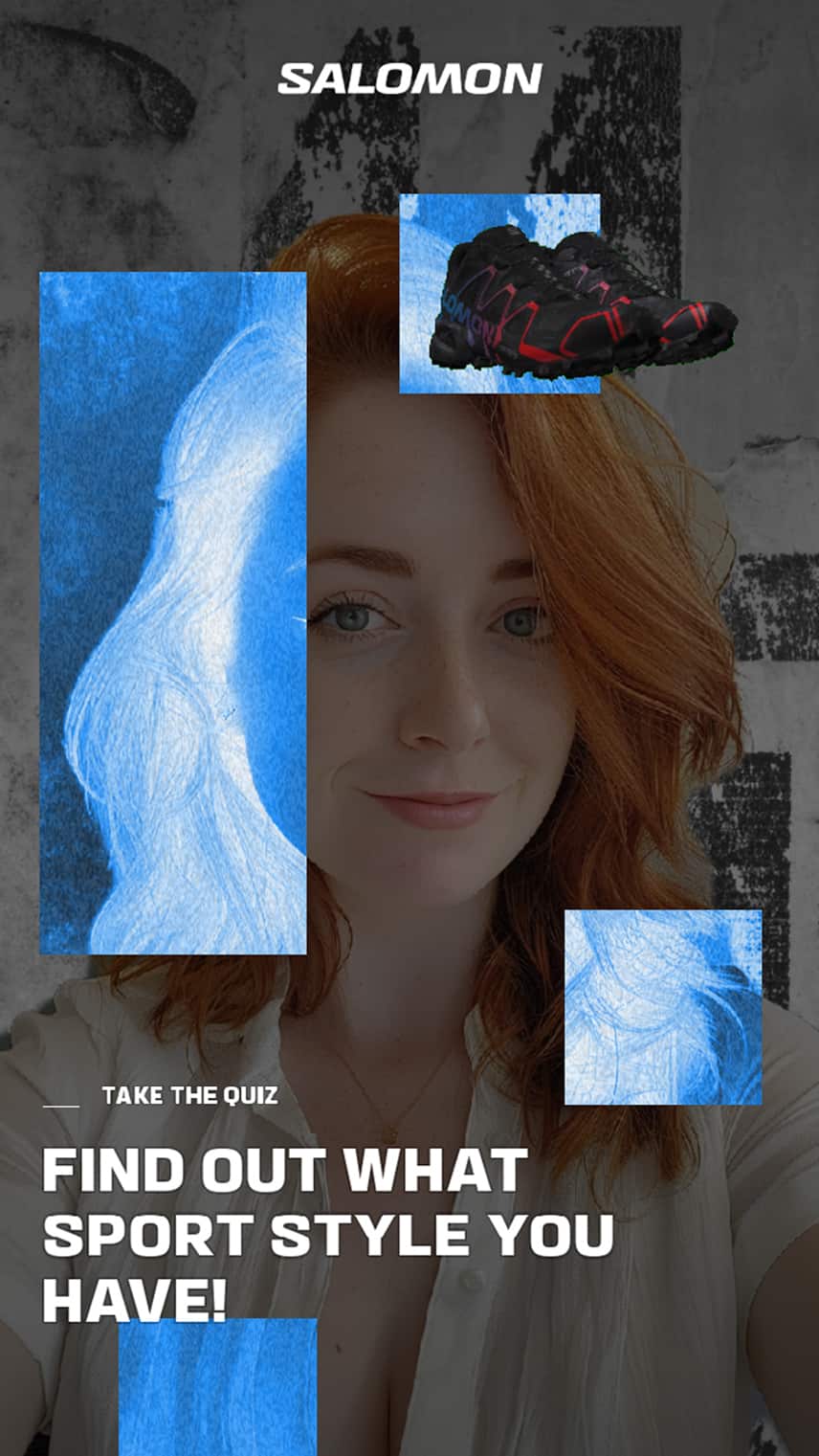 For Salomon we created an innovative Snapchat Lens, that invites users to embark on a journey of self-discovery and style exploration. After a personality quiz reveals the user's unique sport style, they are presented a matching Salomon shoe. Now users can virtually try on their perfect match, choosing from a variety of colors.