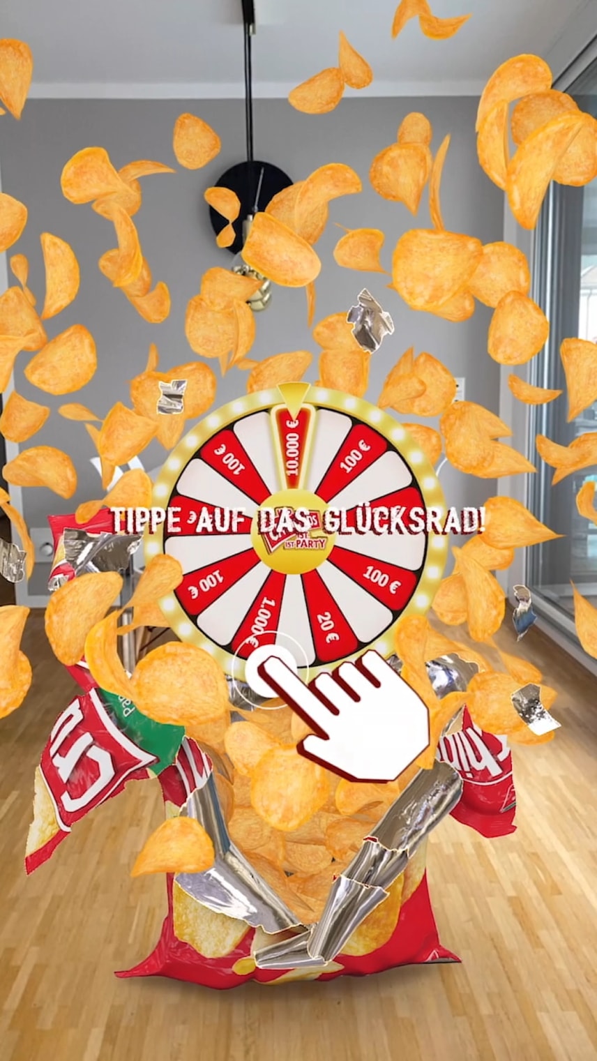 Crunchips makes it rain crisps and prizes - virtually in your own living room. A code on the packaging takes users to a Web AR competition. A virtual wheel of fortune decides who wins prizes for the next party.
